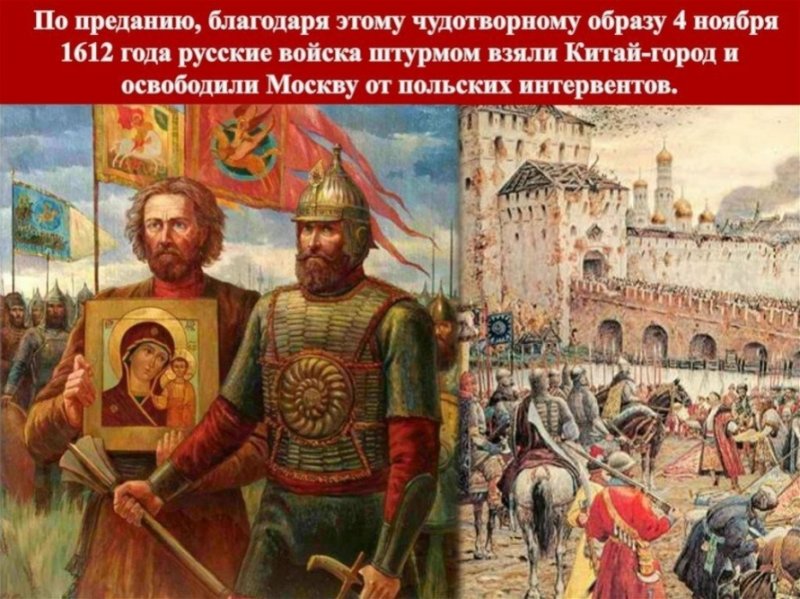 4 ноября Русская Православная Церковь, вместе со всем народом нашего Отечества празднует избавление Москвы от польской интервенции, которое произошло благодаря заступничеству Царицы Небесной посредством чудотворного образа Ее, именуемого Казанским в 1612 г.