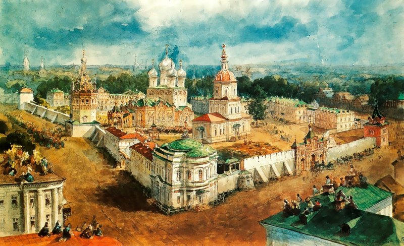 Тем не менее, во время обучения в семинарии М.Я. Диева (это начало XIX века), Введенская церковь еще сохранялась. При ней «на великое пространство расстилался, подобно продолговатому озеру, омут монастырской мельницы», на противоположном берегу Запрудни стояли монастырские службы[18]. После пожара главного корпуса семинарии в 1775 г. преосвященным Симоном с восточной стороны двора было построено новое деревянное здание («огромный дом»)[19]. В 1772 г. семинария была обнесена деревянной оградой, «состоящею с юго-западной стороны из палисадника с тремя воротами, а со стороны восточной и северной из простого забора»[20].