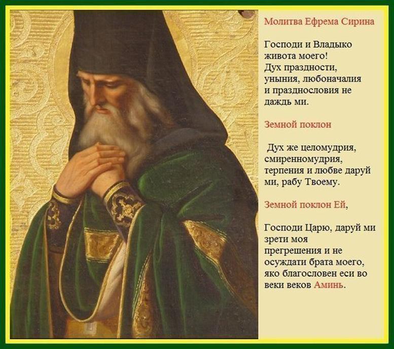 Господи и Владыка жизни моей! Не дай мне склонности к лени, к беспечности, к властолюбию и пустословию. Чистоту же души, смирение, терпение и любовь пошли мне, рабу Твоему. Да, Царь Господи, дай мне видеть мои собственные грехи и не осуждать брата моего; ибо благословен Ты в веки вечные. Аминь. (Молитва на русском языке).