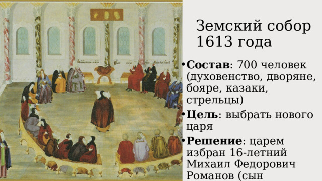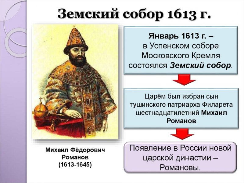 Въ году же 1613 была написана очередная славная страница въ лѣтописи русскаго парламентаризма (лѣтописи, ведомой съ 1550 г., а не съ 1906/1917/1991 гг., какъ принято считать въ нашъ «прогрессивный» вѣкъ) и русской государственной традиціи. Земскій соборъ принялъ рѣшеніе національной важности, опредѣлившись съ персоной главы государства, съ персоной русскаго монарха. Онъ дѣлалъ это и ранѣе: на его созывахъ были избраны на царство или подтвержены въ правахъ наслѣдованія всѣ предыдущіе цари, начиная съ Ѳеодора Іоанновича въ 1584 г. и заканчивая Владиславомъ Жигимонтовичемъ въ 1610. Да и позднѣе, что Алексѣй Михайловичъ въ 1645 г., что Пётръ Алексѣевичъ въ 1682 г. были также легитимизированы этимъ историческимъ парламентомъ. Казалось бы, на данномъ фонѣ ничего особеннаго не видится. И до того начинались новыя династіи, и до того выбирали и подтверждали царей. Но въ этотъ разъ, какъ справедливо отмѣчаетъ историкъ Е. Ф. Шмурло, народъ самъ выбралъ государя не какъ хозяина государевой вотчины, а какъ правителя надъ Русской Землёй, воспринимаемой народомъ какъ своё государство. Потому-то и выборъ былъ столь важенъ.